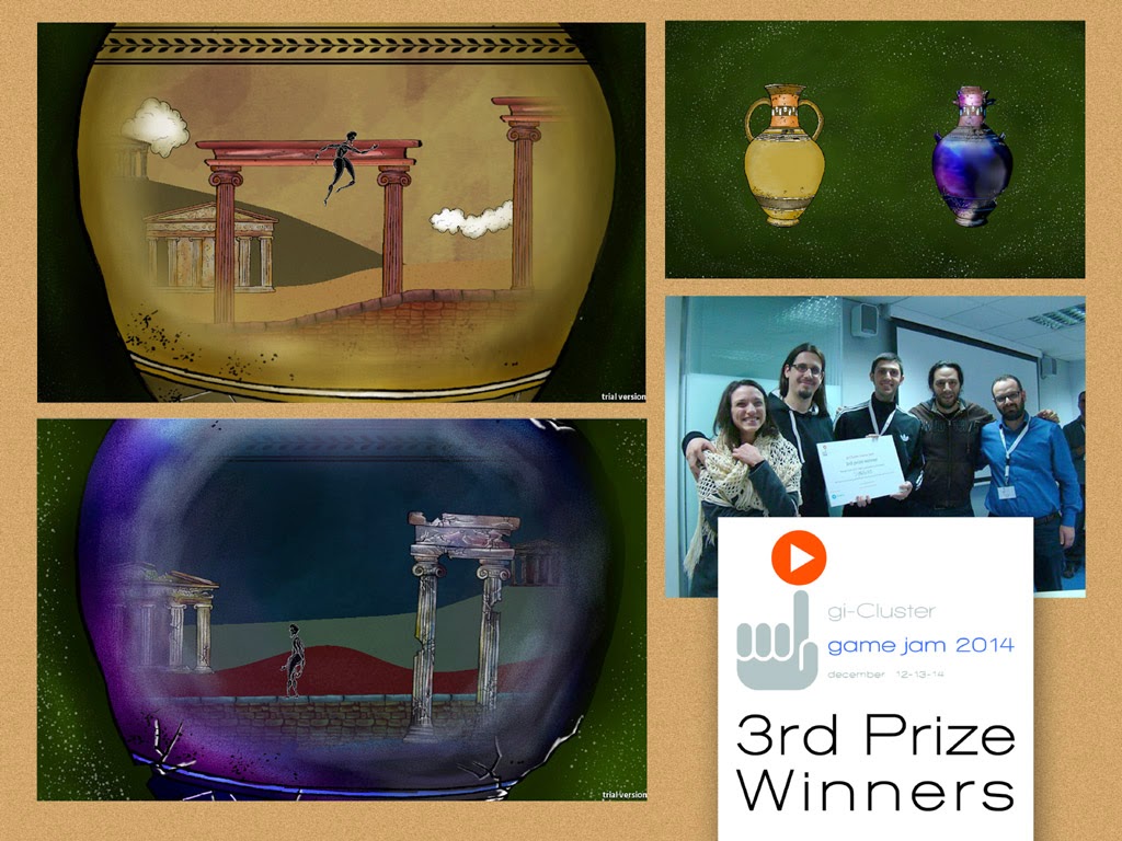Feeling great for our 3rd Prize Win at Hellenic Game Jam 2014 with Synelixis team! This significant game development event was held by Gi-Cluster on December 12,13 and 14 in Athens. More exciting for me: it was my first ever participation in sth similar (personal fields: illustration, line-art)!